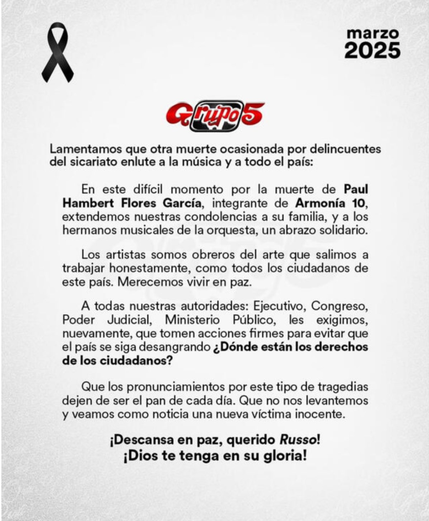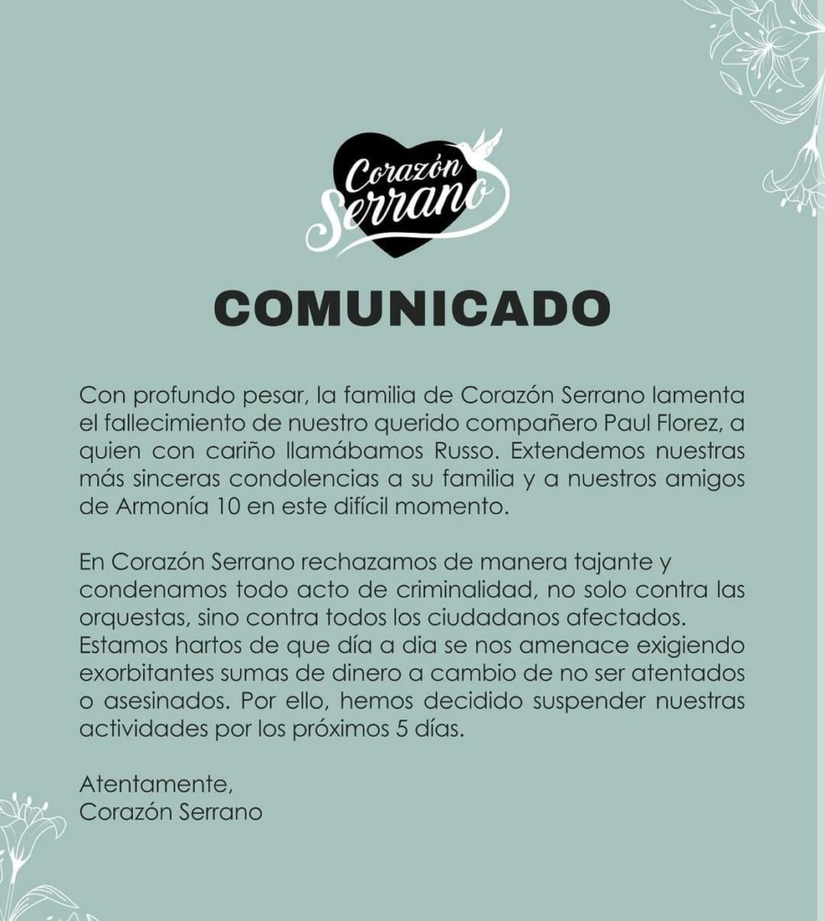 Através de comunicados las orquestas: Agua Marina, Corazón Serrano y Grupo 5 condenaron el atentado y condenaron la inacción de las autoridades a quines responsabilizaron de los permamentes ataques de que son víctimas.