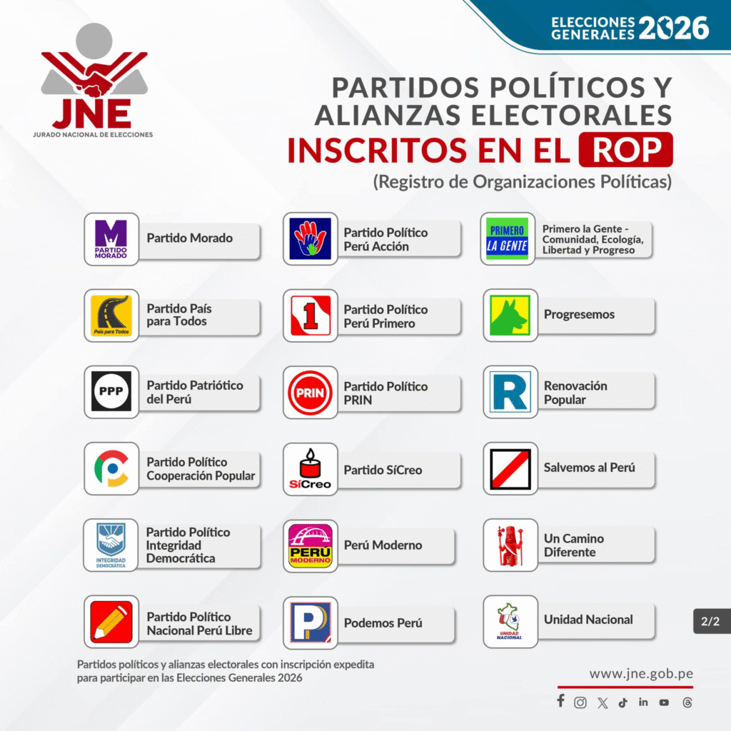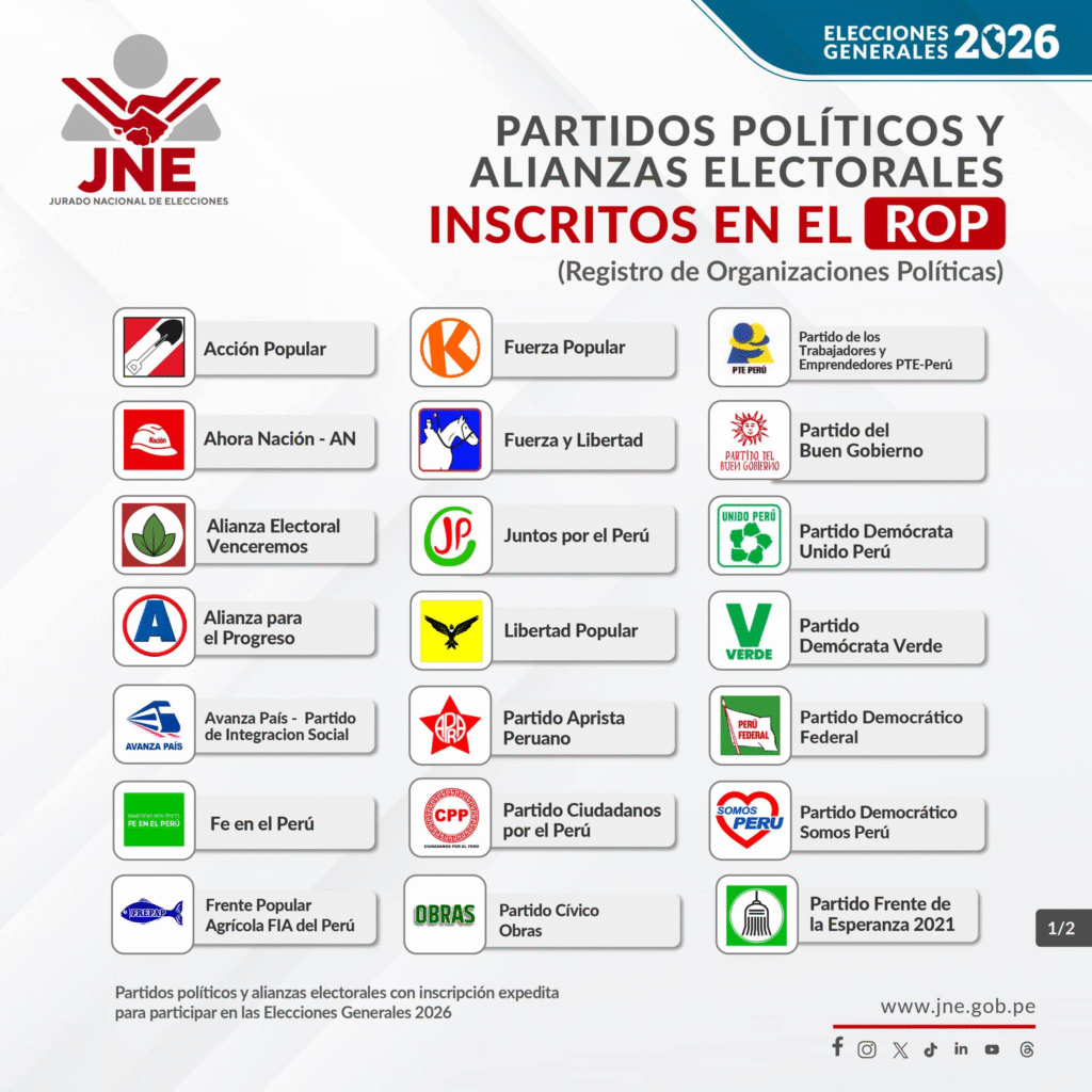 Todo listo para los comicios del 2026. El Jurado Nacional de Elecciones (JNE) informó que 39 organizaciones políticas se encuentran inscritas para participar en dicho proceso tras cerrarse el plazo para la conformación de alianzas electorales.
