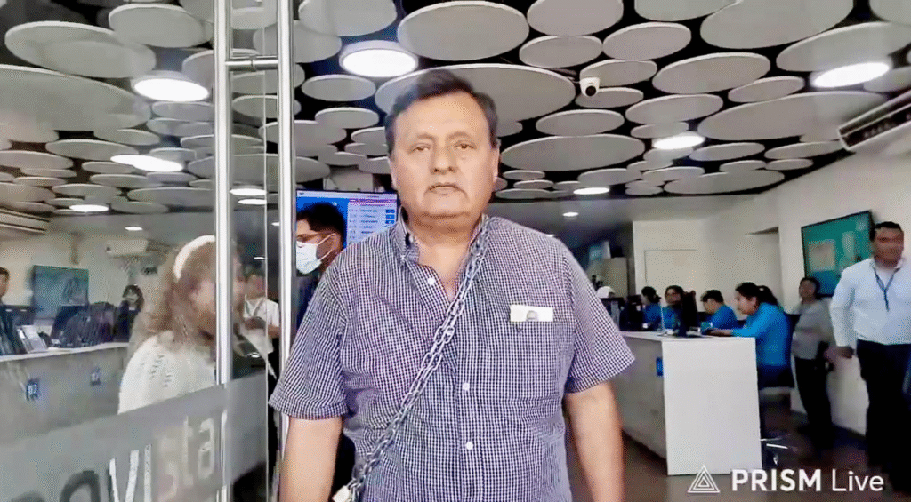 Alejandro Torres permanece encadenado junto a otros choferes y taxistas en la puerta de ingreso de las oficinas de Movistar. Ante la pregunta sobre su permanencia, fue enfático al decir: «voy a estar aquí hasta cuando me saquen a la fuerza».