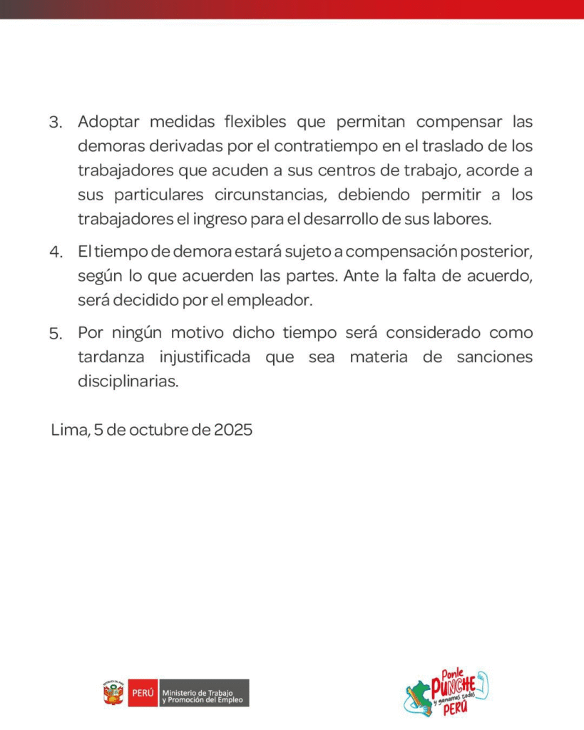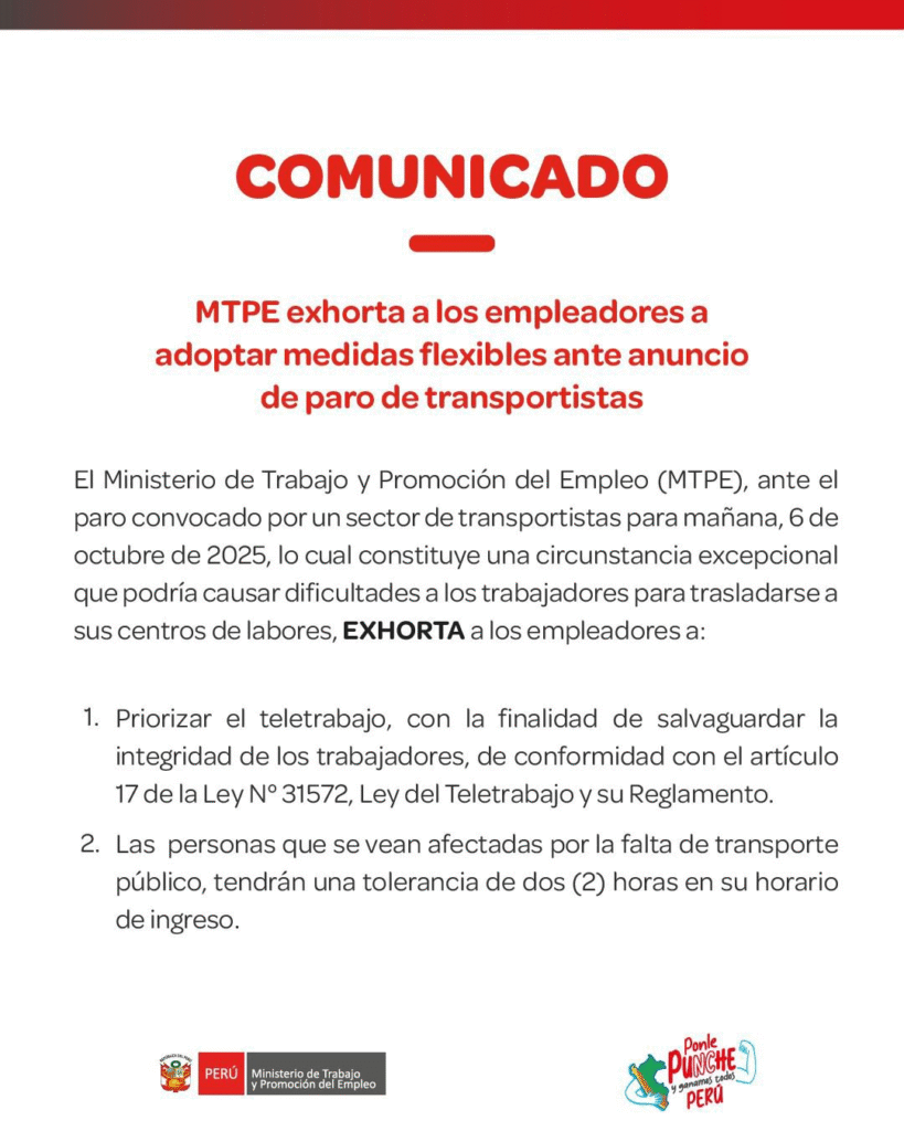 Entre tanto, el Ministerio de Trabajo y Promoción del Empleo anunció dos horas de tolerancia para el ingreso de los servidores a sus centros de labores.