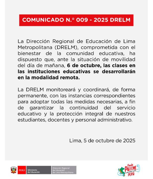 Las labores escolares en Lima y Callao se realizarán, este lunes 6 de octubre, de manera virtual ante el paro convocado por gremios del transporte, anunciaron la direcciones de regionales de educación respectivas a través de comunicados publicados en sus redes sociales.
