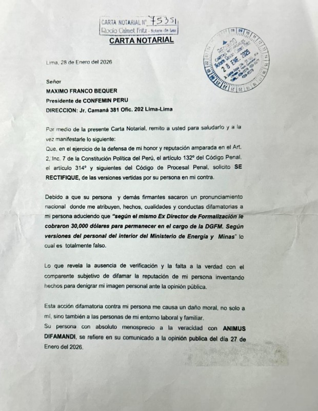 En el documento, dirigido a Máximo Franco Béquer, presidente de CONFEMIN Perú, advierte que se le atribuyen hechos y conductas que nunca ocurrieron, lo que constituye un intento de dañar su imagen personal y profesional.