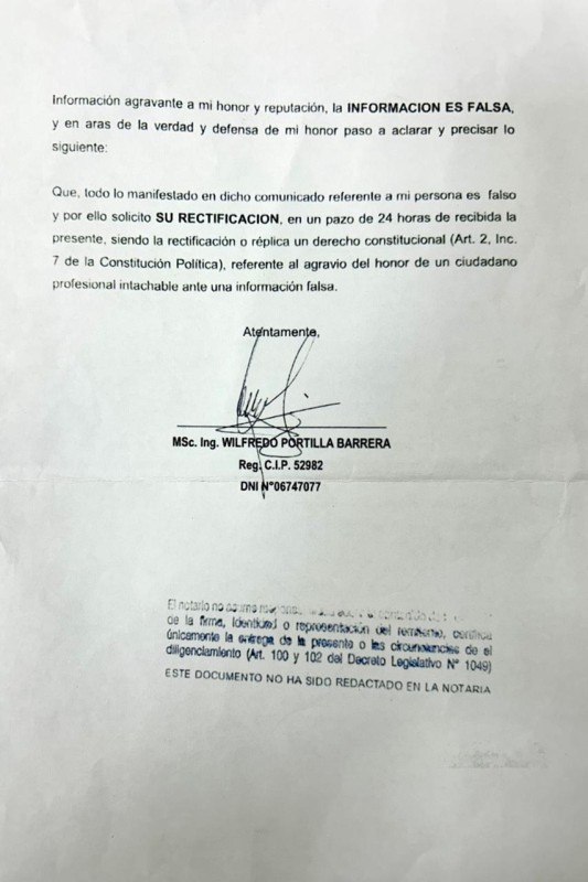 A través de una carta notarial, el exfuncionario señala que las afirmaciones que lo vinculan con pagos irregulares son falsas y difamatorias, y solicita que se rectifiquen en un plazo máximo de 24 horas.