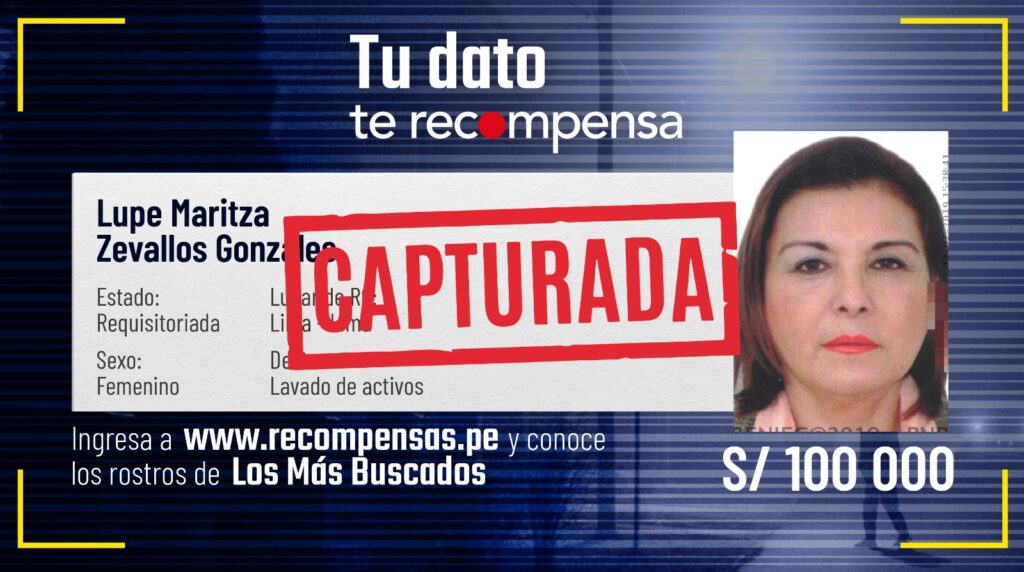 Tras labores de inteligencia, agentes de la División de Investigación contra el Crimen Organizado de la Dirincri ubicaron a Zevallos Gonzales en un inmueble del distrito de San Borja, donde fue intervenida este jueves en un operativo realizado en coordinación con el Ministerio Público.