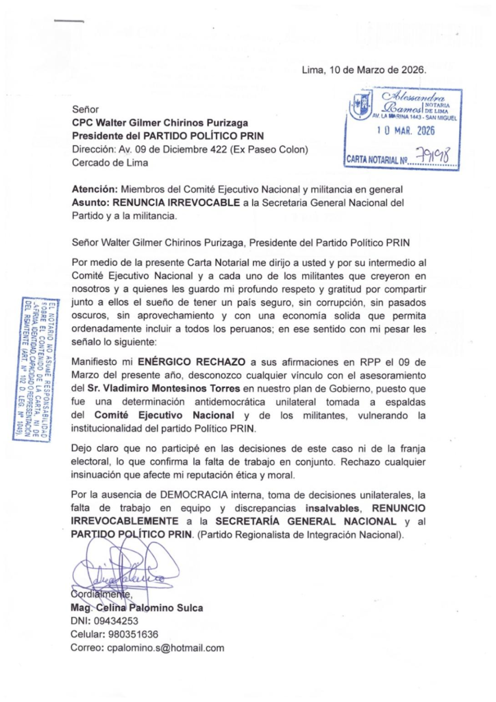 A traves de una carta notarial, Palomino Sulca califica expresa su posición contraria a la participación de Montesinos.