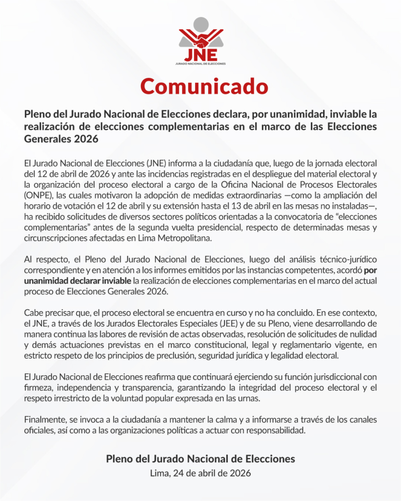 El máximo organismo electoral informó haber recibido solicitudes de diversos sectores políticos orientadas a la convocatoria de «elecciones complementarias” antes de la segunda vuelta presidencial, respecto de determinadas mesas y circunscripciones afectadas en Lima Metropolitana por el retraso del material electoral.